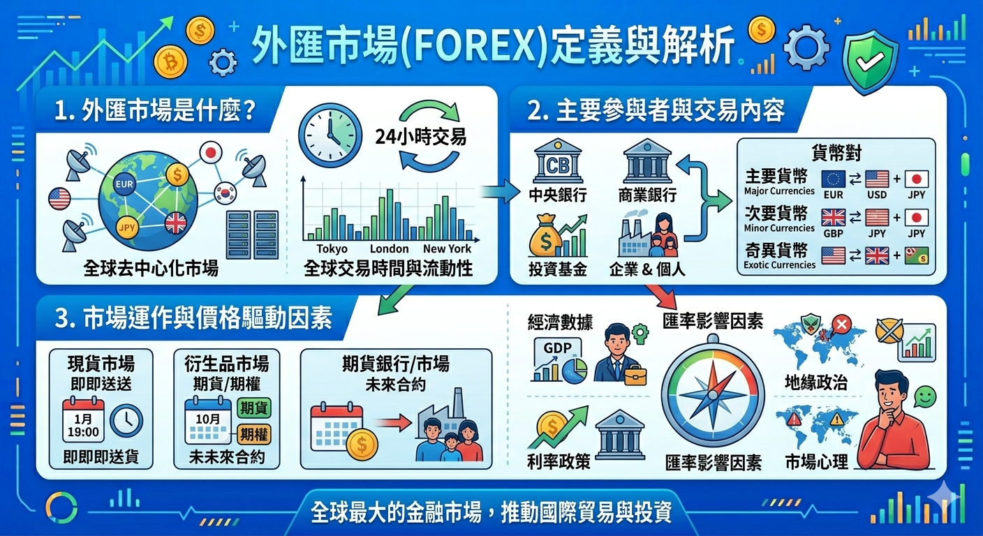 外匯市場(Foreign Exchange Market,簡稱Forex或FX)是全球最大、流動性最高的金融市場,每日交易量高達數兆美元